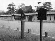 | 京都御所・建寺門(日御門)前の学習院跡地。弘化4年(1847)、公家の教育機関として京都に設けられた。漢学や和学の講義が行われ、主に15歳以上40歳以下の公家の志願者が受講した。設立後、欧米の艦船が来航して開国を要求、尊王攘夷運動が活発になるが、学習院はその一面集会所の役割も果たした。 | ||
