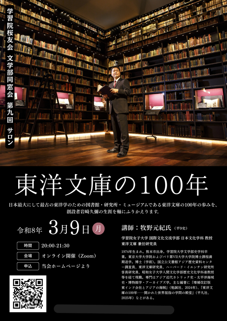 文学部同窓会第9回サロンを下記の通りオンライン講演会形式で開催いたします。 【日時】令和8(2