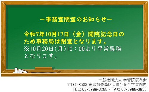 ー事務室閉室のお知らせー 令和7年10月17日(金)開院記念日のため事務局は閉室となります。 ※電気設備の点検は、ございませんのでFAXは通常通り受信します。