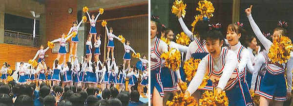 <近況を追記>応援団 元気を届ける・・・令和元(2019)年10月17日、被災地復興応援として郡山市の郡山第一中学校を訪れ、応援やチアリーダーの演技、吹奏を披露し、生徒に元気を届けました。リーダー部、吹奏楽部の学生114人が同校の生徒734人と交流しました。