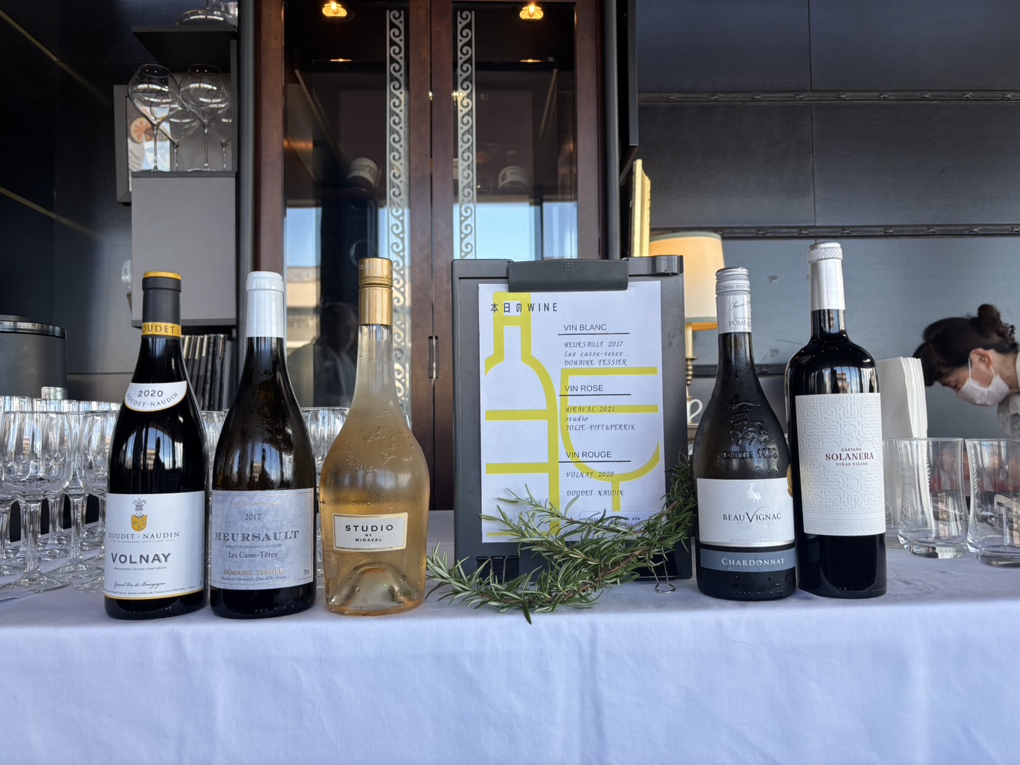 本会は赤レンガ倉庫とベイブリッジを一望に見渡せる会場で、ウェルカムドリンクの白ワインを炭酸水で割ったスプリッツァーにひきつづき、竹口世話役の乾杯音戸と共に、ブラッド・ピットとアンジェリーナ・ジョリーの畑のロゼであるStudioで乾杯し、次にブルゴーニュをテーマとして、白の畑銘付きムルソー、赤のヴォルネイ、さらに飲み足りない方への赤のスペイン…とワインを堪能いたしました。