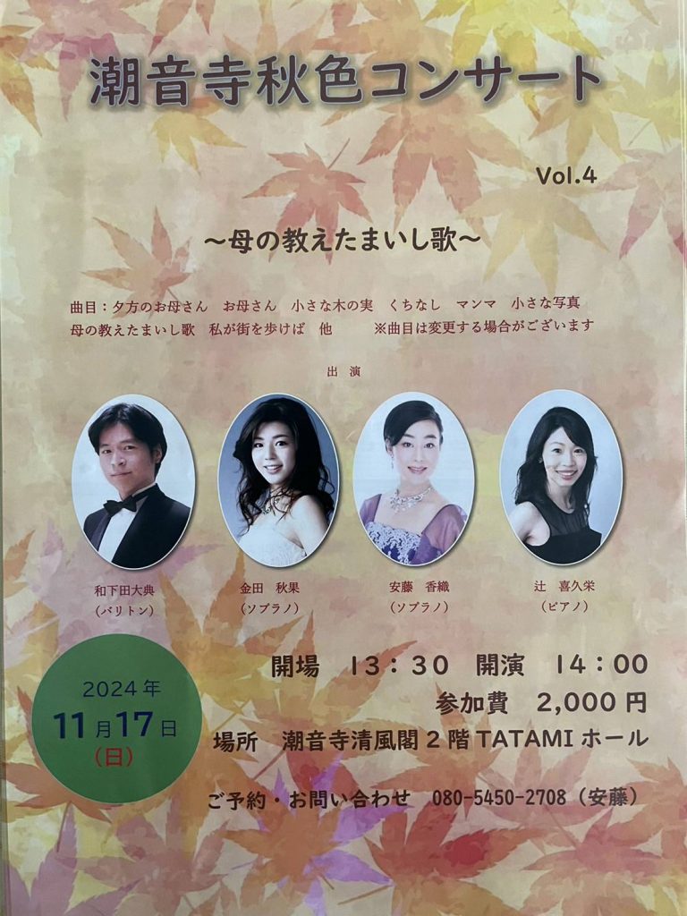 さて音楽同好会では今回は「潮音寺秋色コンサート」に参加することになりました。サブタイトルが ~母の教えたまいし歌~ ということで、大変楽しみなコンサートになると思います。 晩秋のひと時を美しい歌声に酔いしれてみませんか?