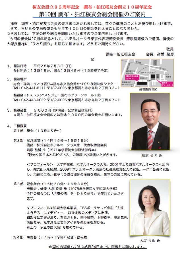 ご希望いただいている会員の皆さまには、上記「第10回 調布・狛江桜友会総会開催のご案内」をお送りしました。同封の返信ハガキは6月24日までに投函をお願いします。なお、今後もご案内をご希望の方 は、ご欠席の場合でも必ず返信ハガキをご返送いただきますようお願い致します。ご返信のな い方には次回からのご案内が届かないことがありますのでご注意ください。、今後もご案内をご希望の方 は、ご欠席の場合でも必ず返信ハガキをご返送いただきますようお願い致します。