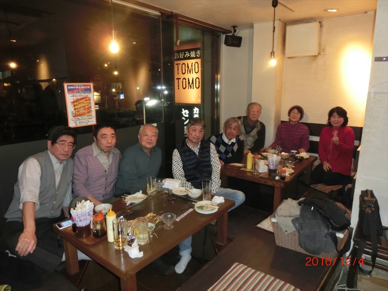 2016.12.04 全国支部:調布・狛江桜友会 平成28年調布・狛江桜友会忘年会を開催致しました。 平成28年12月4日(日)、本日の「福祉バザー」終了後、西調布の「Tomotomo」で調布・狛江桜友会の忘年会を開催致しました。一年間の活動を振り返りながら、会員の皆様の活動を労いつつ、楽しく相互の懇親を深めることができました。(写真提供:竹下裕美) 忘年会の様子