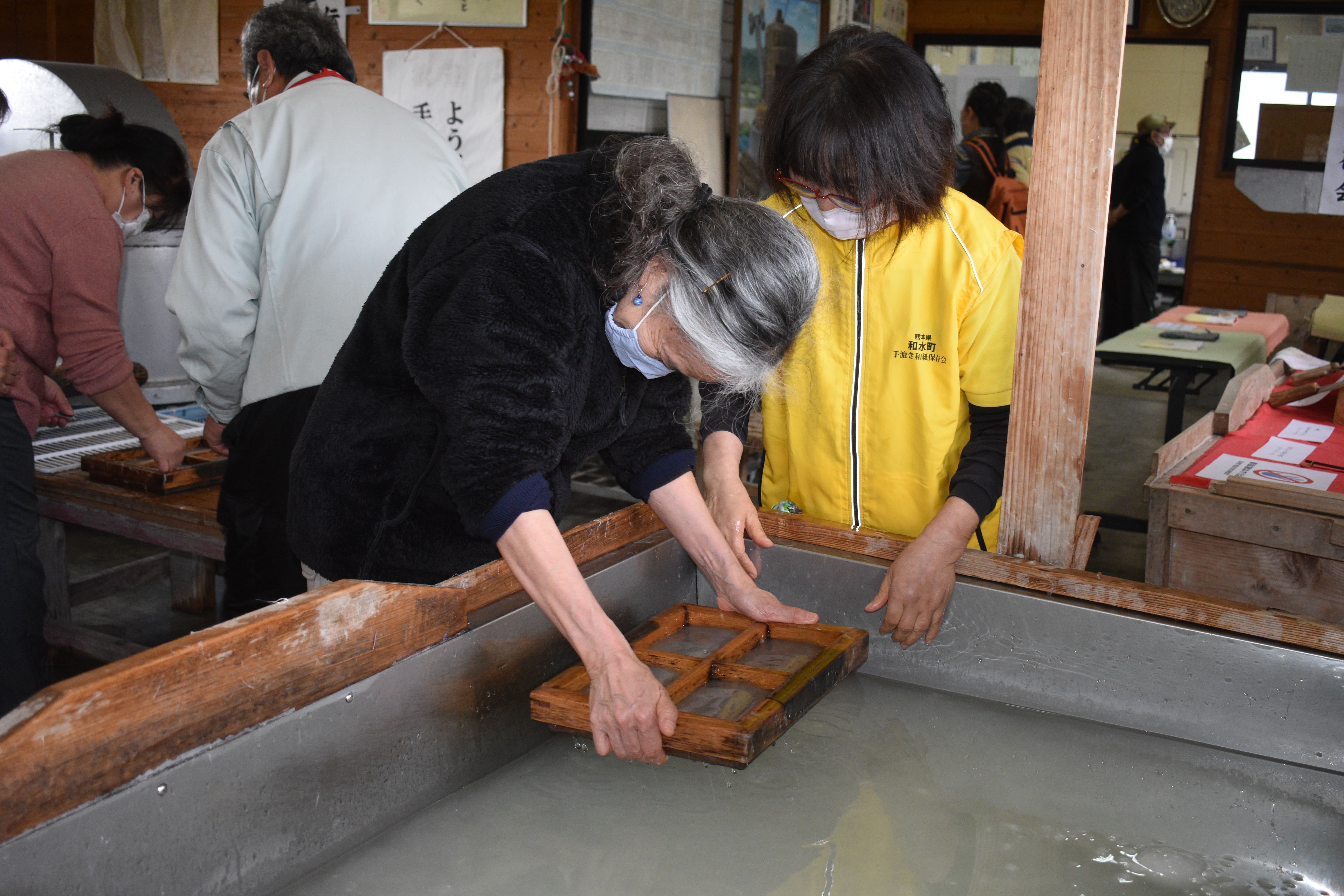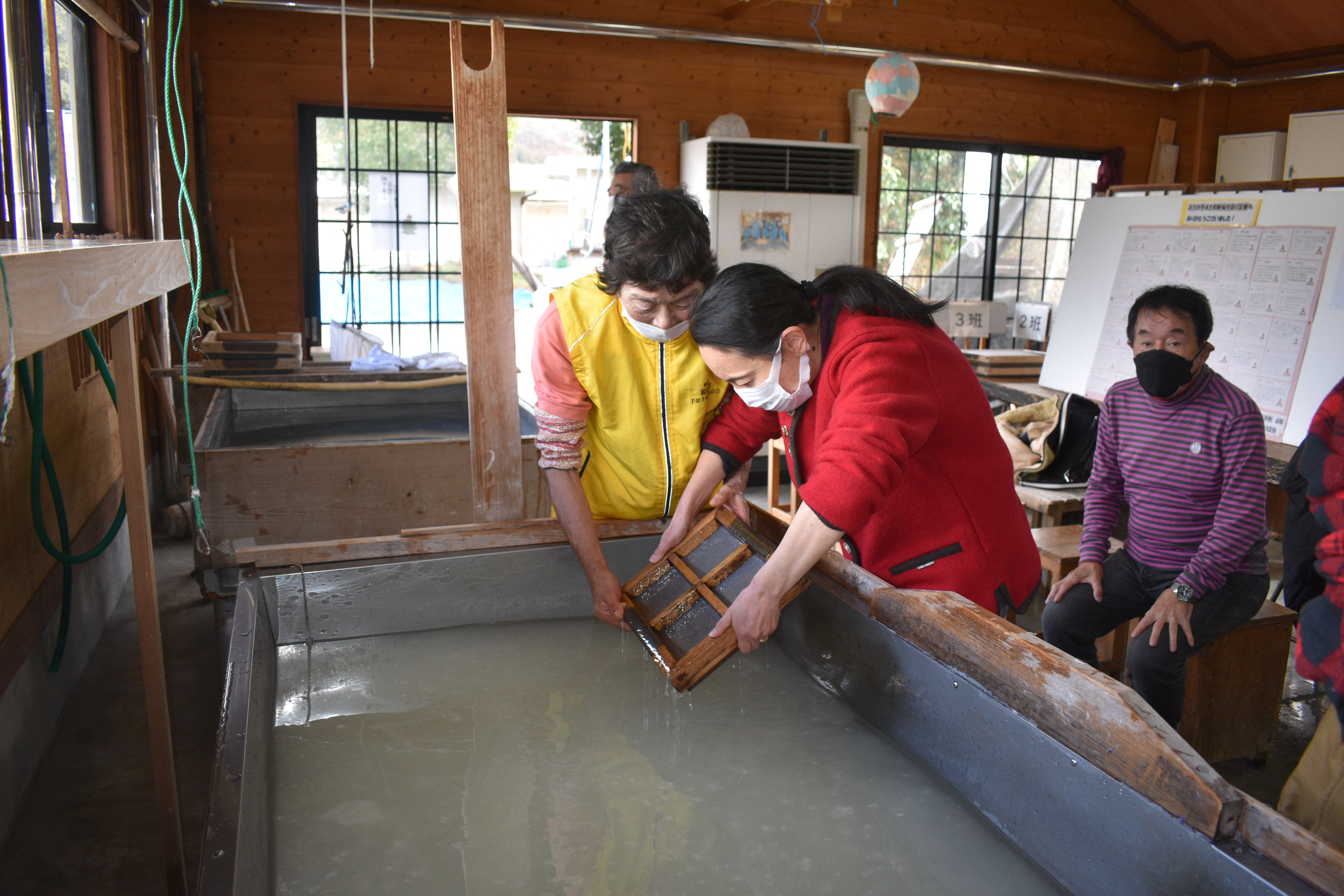 保存会の方に個別に指導を受けながらハガキを手漉きしました。