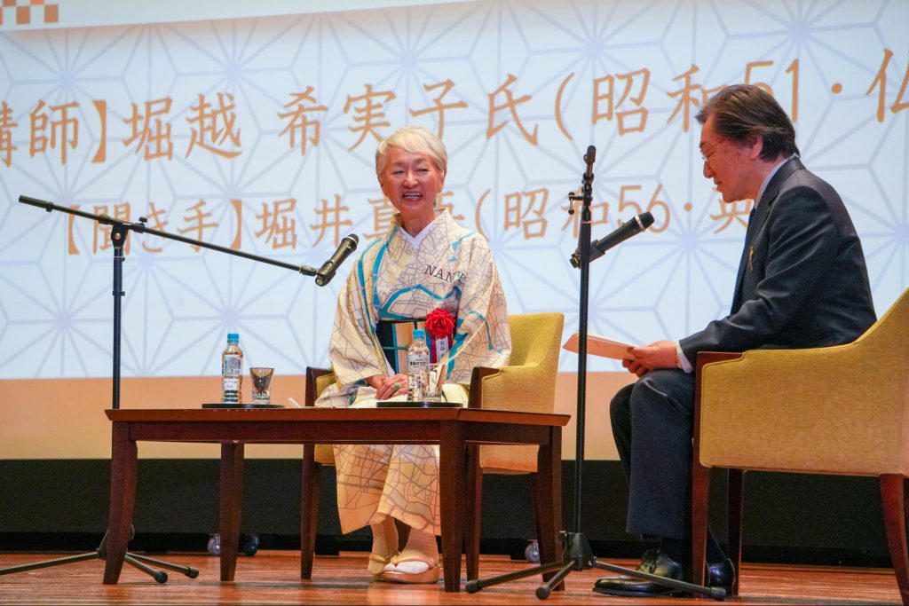 今年の講師は、昭和51年に本学フランス語フランス文学科を卒業された堀越希実子氏。12代目市川團十郎夫人であり、13代目市川團十郎白猿氏の母として、梨園を支えてこられたご経験を語ってくださいました。