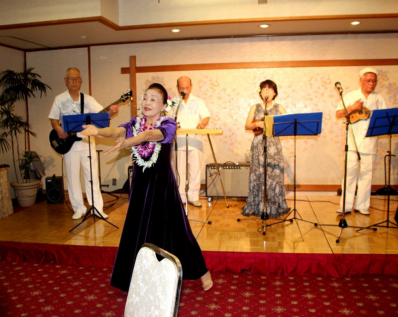 また、懇親会では、特別出演として、ハワイアンバンド「レイ・アイランダース」(代表 今井 彰彦氏S38政経卒)の皆様によるBGM演奏(フラダンス付き)があり、楽しい懇親会となりました。