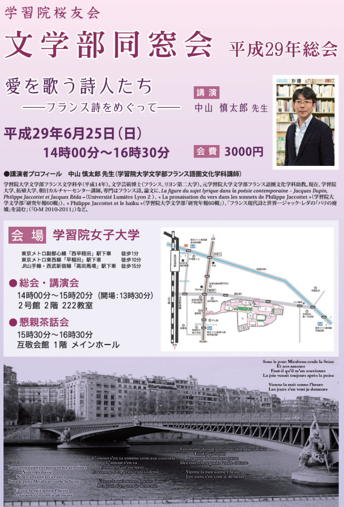 今回の講演会は、中山慎太郎先生(平14仏)の「愛を歌う詩人たち―フランス詩をめぐって―」。リヨン第二大学で博士号を取得し、この3月までフランス語圏文化学科(旧フランス文学科)の助教を務めていた気鋭の若手研究者のお話をぜひ聞きにいらしてください!