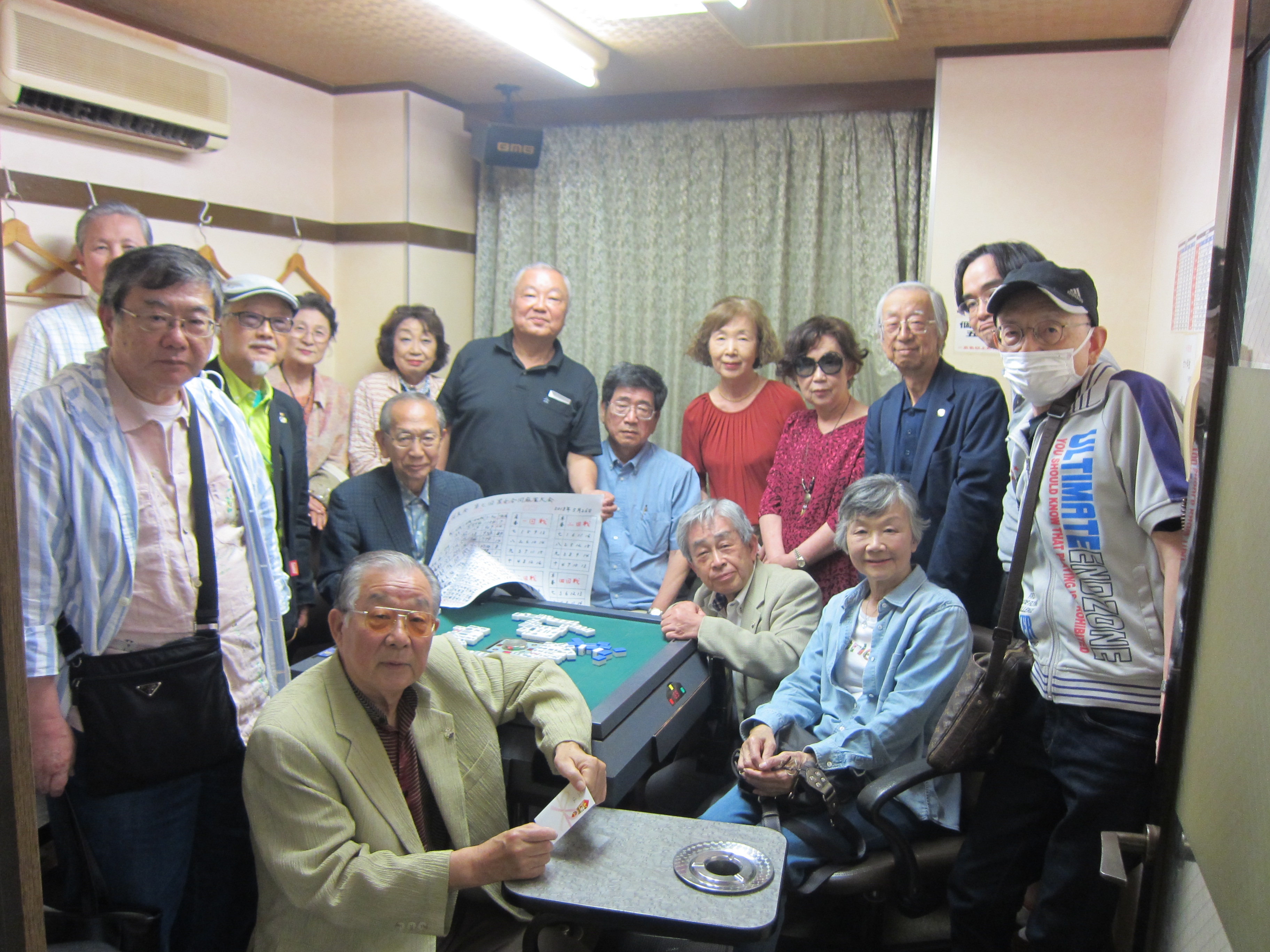2018.05.26 全国支部:調布・狛江桜友会 第7回調布・狛江桜友会男女合同麻雀大会を開催しました。 皆様 本日、平成30年5月26日、第7回調布・狛江桜友会男女合同麻雀大会を、「麻雀スミダ」(於:国領)にて男子:11名、女子5名の計16名の4卓で開催しました。会場は、真剣ななかにも和気あいあいとした雰囲気のなかで楽しいひとときを過ごすことが出来ました。優勝は、五十嵐 一美(昭40大文哲卒)さんでした。また、遠藤 伸司(平9大経済卒)さんが国士無双の役満をしました。参加者の全体写真を御覧ください。クリックすると写真を拡大してご覧いただけます。男女合同麻雀大会担当幹事(調布狛江桜友会会長)渡辺 格 第7回調布・狛江桜友会男女合同麻雀大会を開催しました。