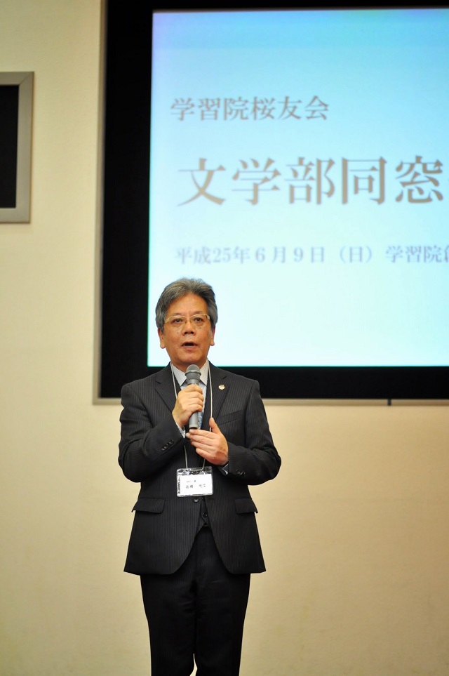 はじめに、文学部同窓会会長で学習院女子大学教授の岩﨑光洋先生(昭50英)から、開会の御挨拶です。