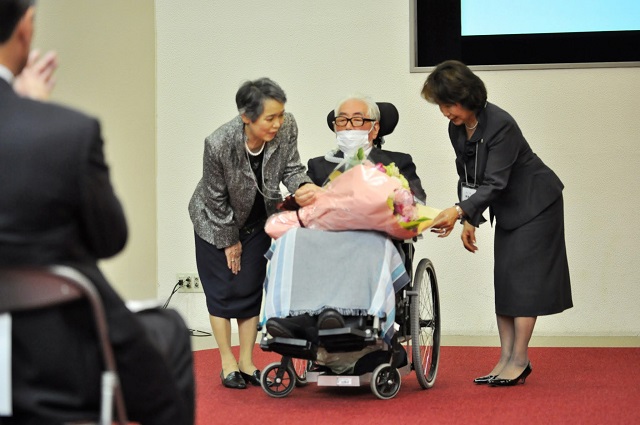 次に、文学部同窓会名誉会長で学習院大学名誉教授の篠沢秀夫先生(昭32仏)が受勲されたことを記念し、同窓生代表から花束を贈呈いたしました。