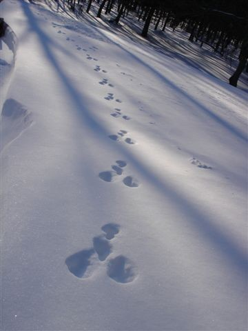 雪の上、小屋近くにしっかりとラインができたお客様の足跡。