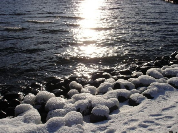 またまた、中禅寺湖畔ですが、湖面の太陽の道と石の上の雪。