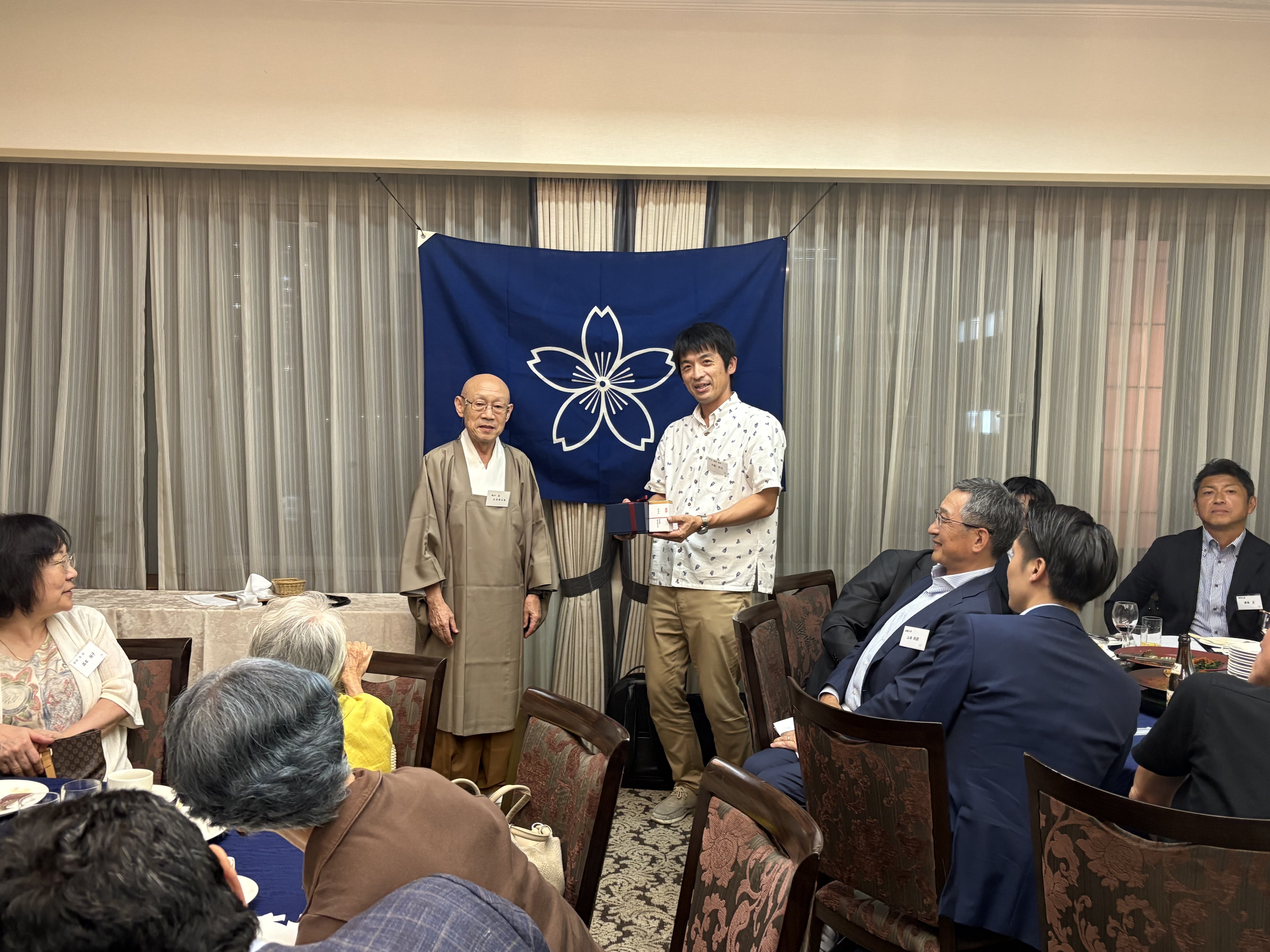 2025年9月11日(木)にガーデンシティクラブ大阪にて二木会が開催されました。講師は国土交通省近畿運輸局勤務の大曲将之氏(平成13年大経済・経営卒)がお引き受け下さり、『離島の支援等について』というテーマでお話し下さいました。離島の定義や各地の離島のお話、離島を守るための法律、離島に居住する方への様々な支援、離島に人を呼ぶための計画などのお話に、満席になるほど大勢集まられた皆様は興味深く耳を傾けておられました。今回は東京からお越しくださった方もいらして、とても賑やかな会になりました。