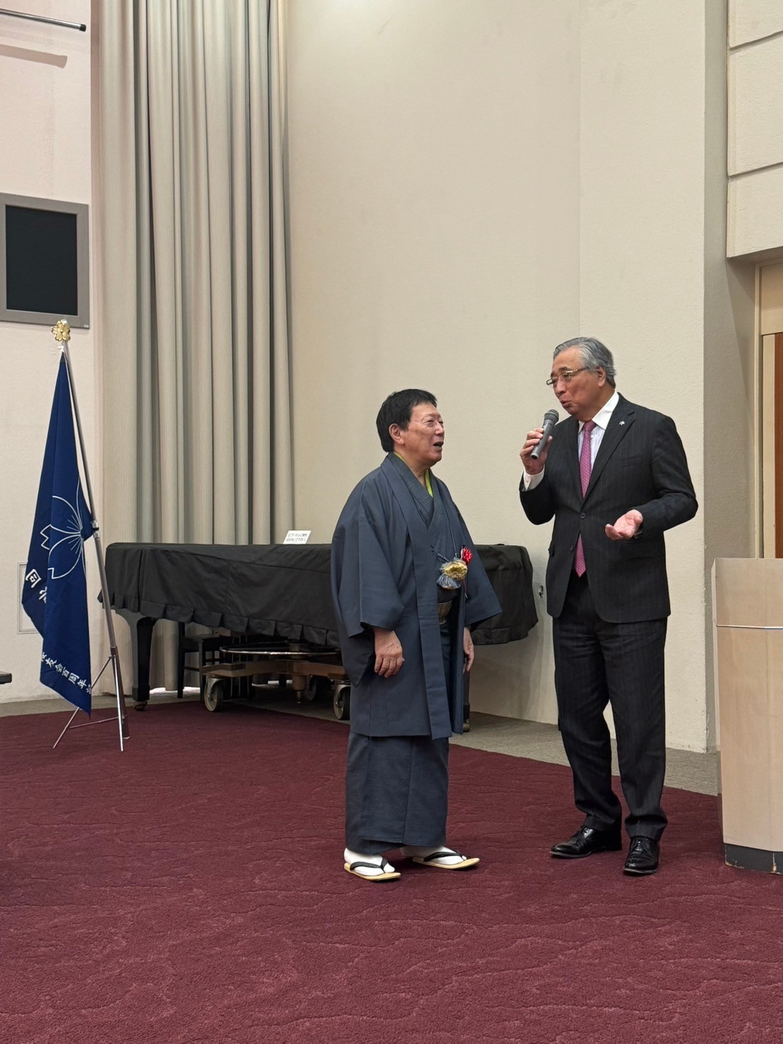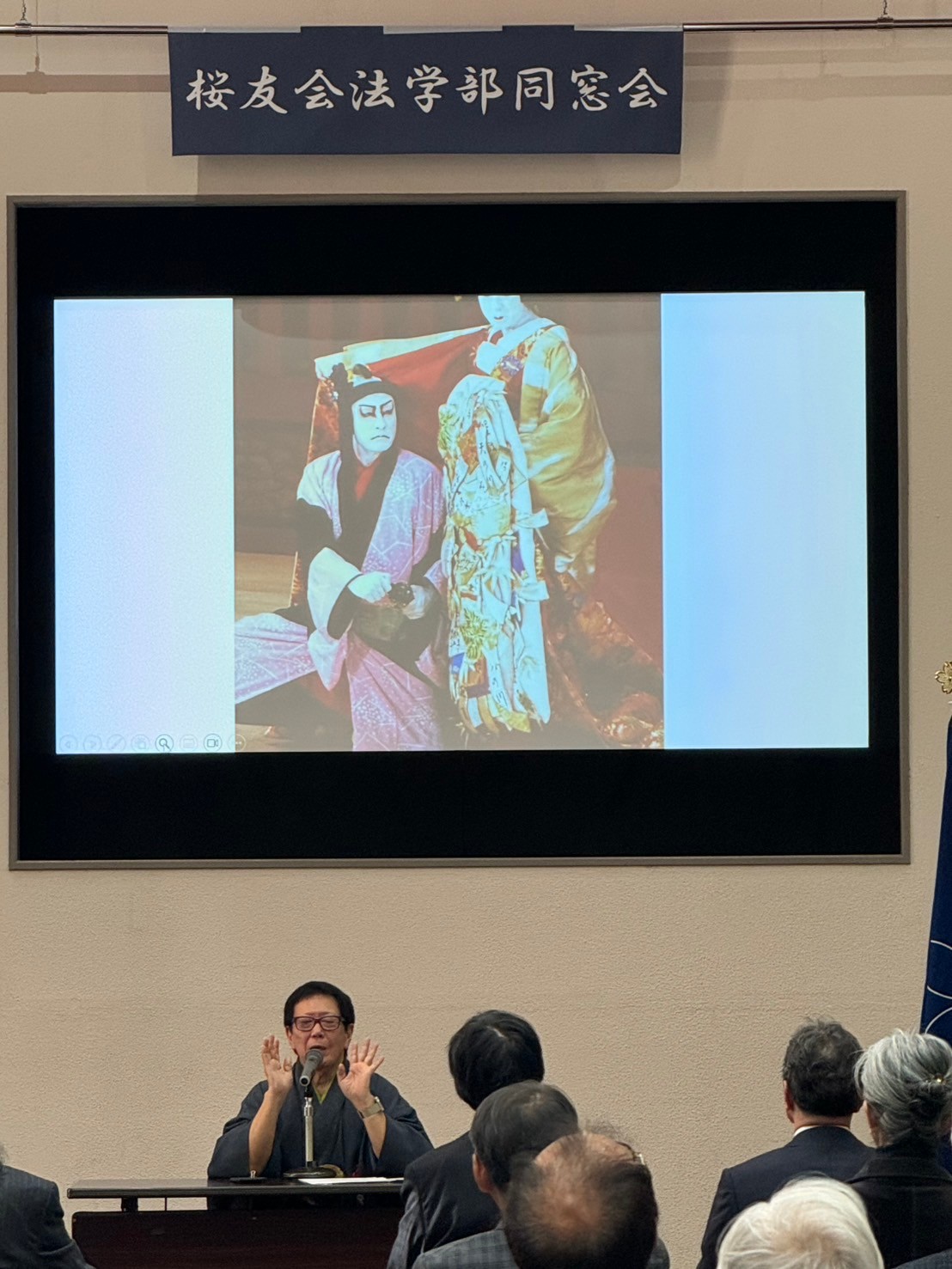 講演会では元NHKアナウンサー、現在はラジオニュースを担当しつつ現役のボディビルダー、そして歌舞伎のイヤホンガイドもされている鈴木桂一郎氏(1975年(昭和50年)法学部卒)をお招きし、『歌舞伎で訪ねる江戸文化』というテーマでお話しいただきました。