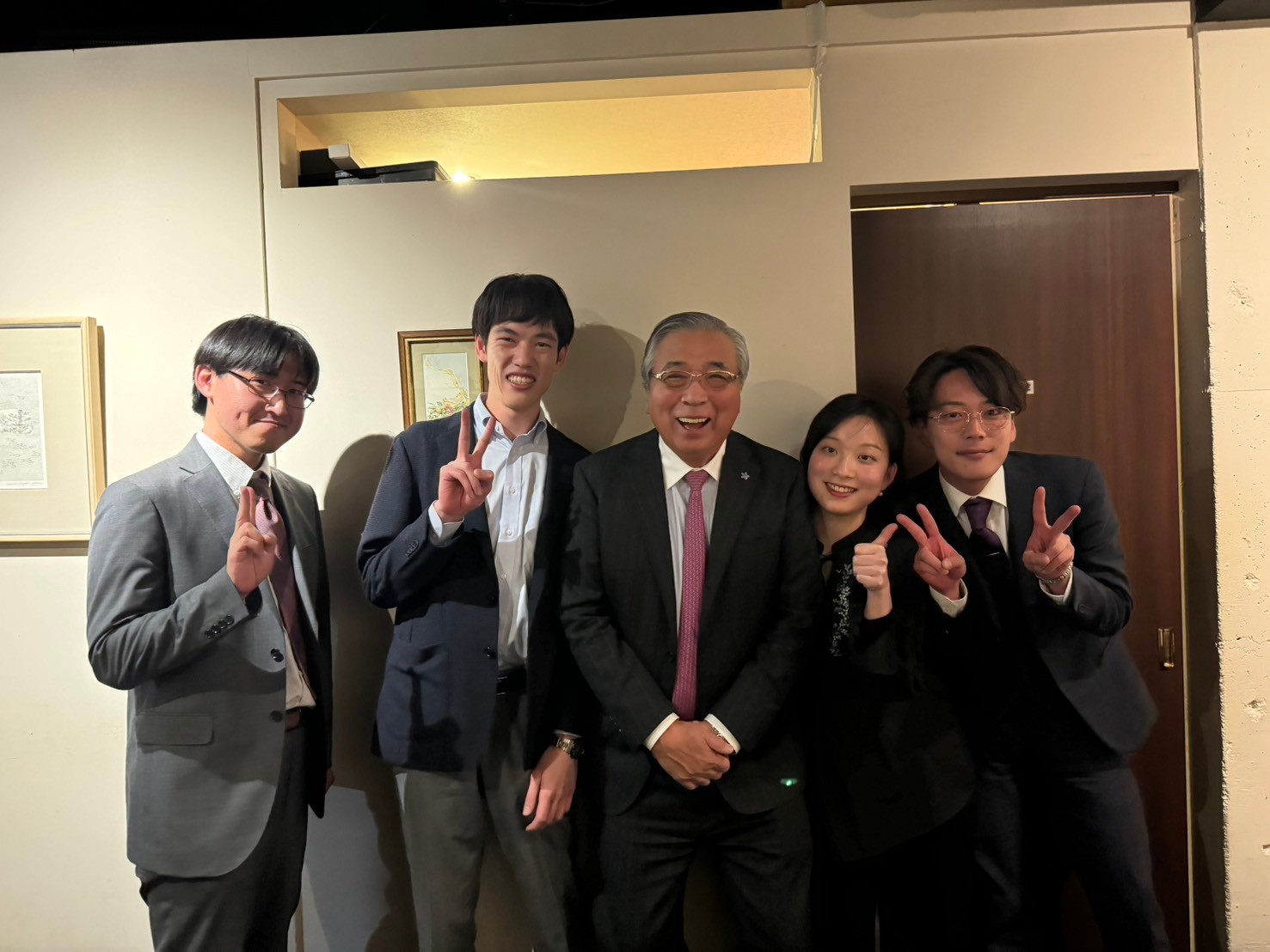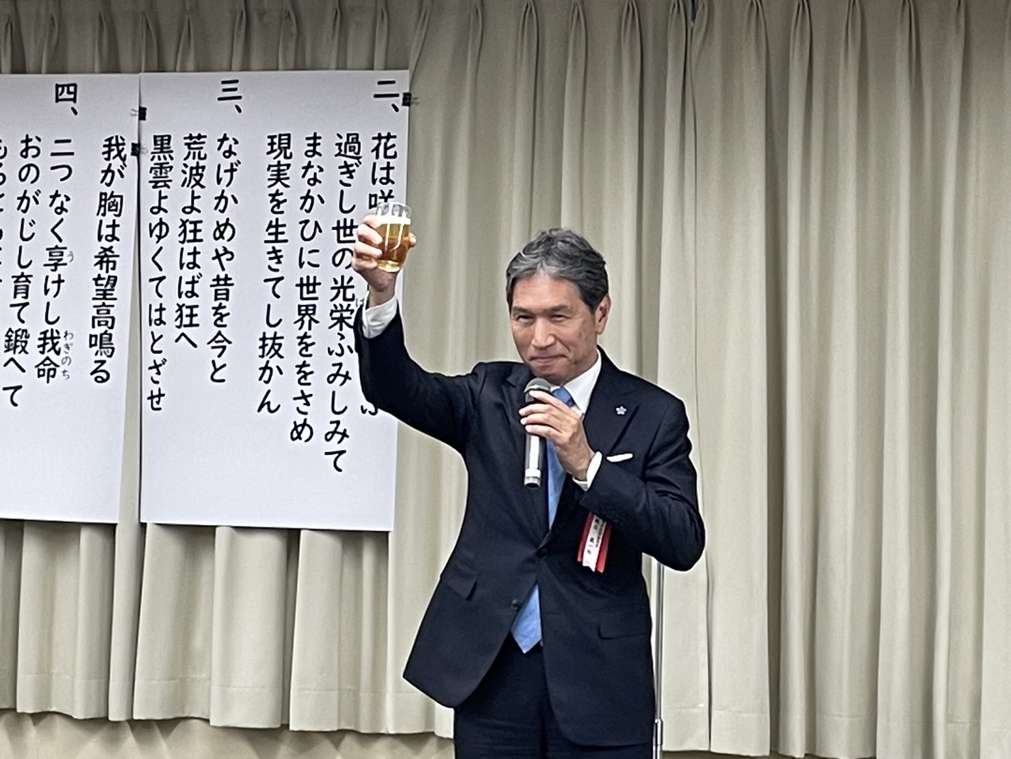 続けて3階会議室での懇親会では平野専務理事、諸戸桜友会会長、飯田法学部長、城谷常務理事にご挨拶いただき、当会理事並木哲彦氏(平成6年卒・櫻援会会長)の音頭のもと院歌斉唱。