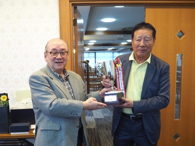優勝された仙石秀彦氏(昭42経済卒)グロス83 ネット72へ、ゴルフ会新会長の鈴木明氏(昭51化卒)から理学部同窓会ゴルフ会優勝カップが手渡されました。準優勝は吉野美佐枝氏(元法経図書館)グロス93 ネット72でした(ハンディーキャップが少ない方が上位)。今回は二人の初参加があり、楠田公明氏(昭52物卒)が3位、松尾仁氏(昭52化卒)が5位と健闘されました。