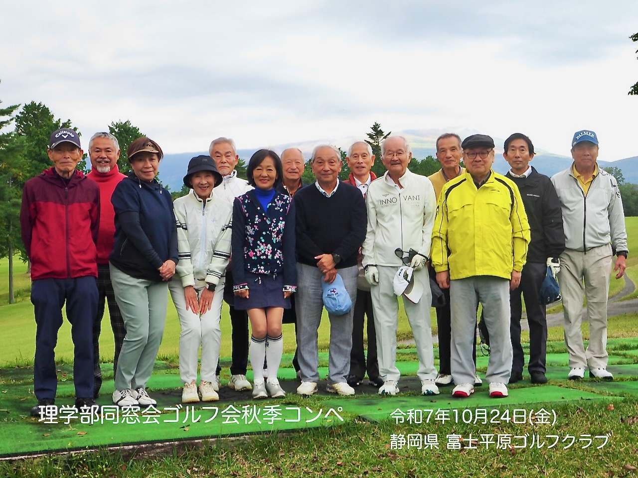 第35回理学部同窓会ゴルフ会の秋季コンペが富士山の麓にある富士平原ゴルフクラブにて参加者15名で開催されました。春季コンペは悪天候のため中止となり半年ぶりの開催となりました。当日の天候は晴れ時々曇り、昼過ぎから小雨という予報。集合写真撮影時は曇りでしたが、スタート時にはパラパラと雨が降りはじめ、終日雨が降ったり止んだりという中でのプレーとなりました。