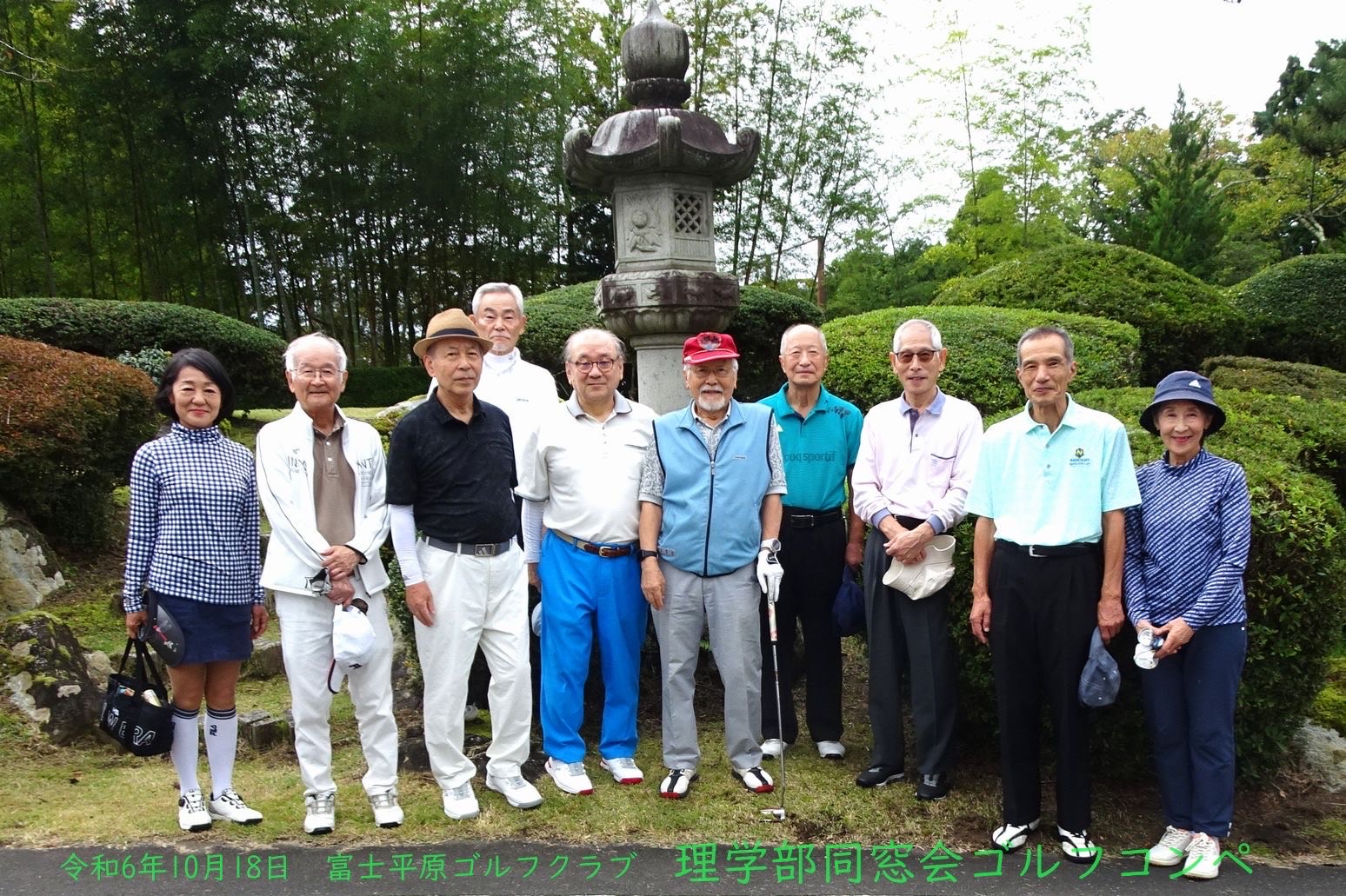第34回理学部同窓会ゴルフ会の秋季コンペは、令和6年10月18日 (金) 秋の暖かい天気の中、富士山の麓にある富士平原ゴルフクラブにて参加者10名で開催いたしました。最終ホールとなった”天国と地獄”と命名された丹沢コース9番ホール パー5では、初冠雪の富士山がコース正面に顔を出して”天国”の意を知ることに。スコアを気にしながらも笑顔で楽しい1日となりました。