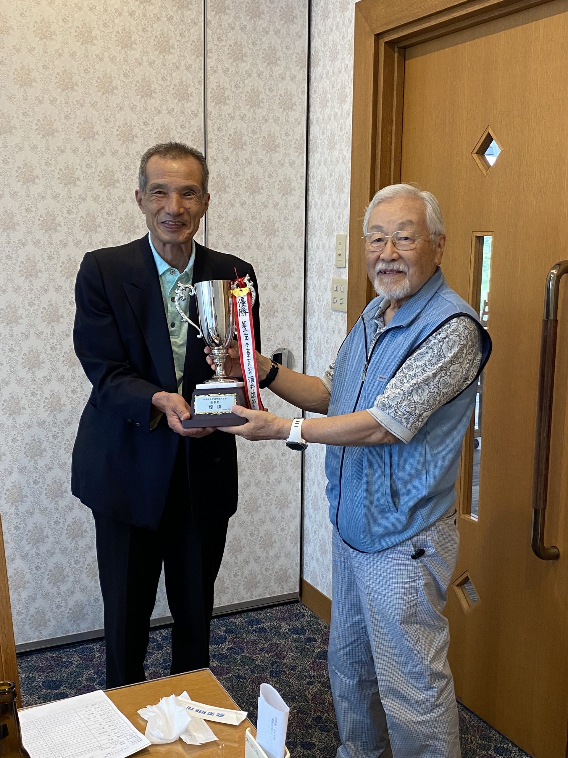 第34回優勝は、奈蔵理之氏(昭42年化卒, 写真右から二人目)グロス84、ネット 67で獲得され、前回大会優勝の酒井佐芳氏から理学部同窓会優勝カップが手渡されました。準優勝は、吉野誠氏(昭53物卒)グロス89、ネット74でした。