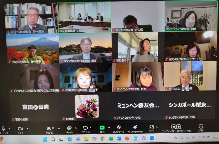 令和6(2024)年12月7日(土)に海外支部代表者会をオンラインと桜友会会議室の併用にて開催しました。11カ所の海外支部と5カ所の日本支部、帰国されている方々の総勢26名ほどが活発な意見交換を行いました。