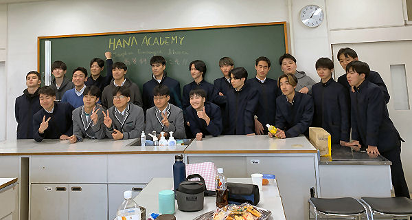 男子高等科の家庭科実習教室に、現在、来日している留学生と在校生が集まり、弁当とお菓子をつまみながら交流しました。留学生は昨秋から一年間の予定で来ているブラジル一名、トルコ一名、韓国からは一週間の体験留学生三名でした。ブラジル、トルコの留学生は学習院の詰襟を着用し、また、韓国の学生達は自分たちの高校のグレーの制服で参加していました。