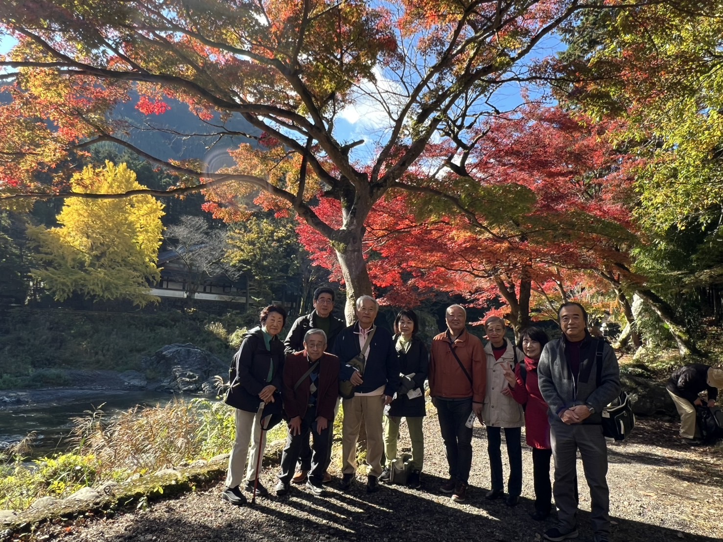 ところが多摩川のほとりにたちましたらなんと対岸の川合玉堂玉堂美術館前の有名な大イチョウの木がぜんぶ黄色に大変身していました。こちら側のおおモミジも綺麗に真っ赤に紅葉していまして皆で思わず歓声をあげてしまいました。(写真①)多摩川上流の御岳渓谷は東京でも美しい紅葉の名所ですし遊歩道を歩きながら川沿いのほうに目を移しますと巨岩と清流の渓谷美が荘観できまさに風光明媚な眺めを堪能できました。