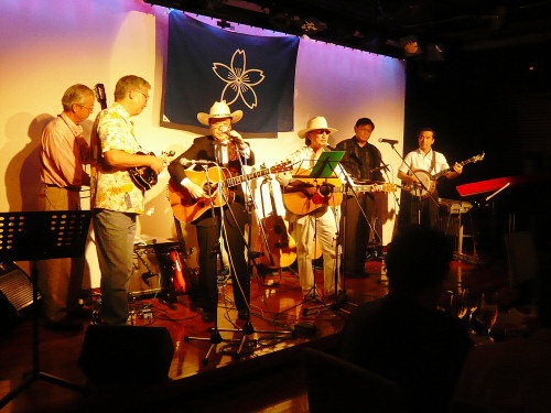 ライブ演奏の2番手として、カントリー桜友会会長率いるGUN FIGHTERSが登場。このバンドは他校卒業生も参加している混成バンドで、昔懐かしいカントリーの名曲を中心に多くのレパートリーを持っています。会員で会計事務局の磯野美樹さん(平成14法卒)、野間信彦(昭和45政治)の歌のほか、川原三郎さん(昭和43経済)、水上立英さん(昭和50経済)白井雅昭さん(昭和48年経済)などがゲスト歌手で参加し、幅広い年代の会員によるライヴステージを行いました。