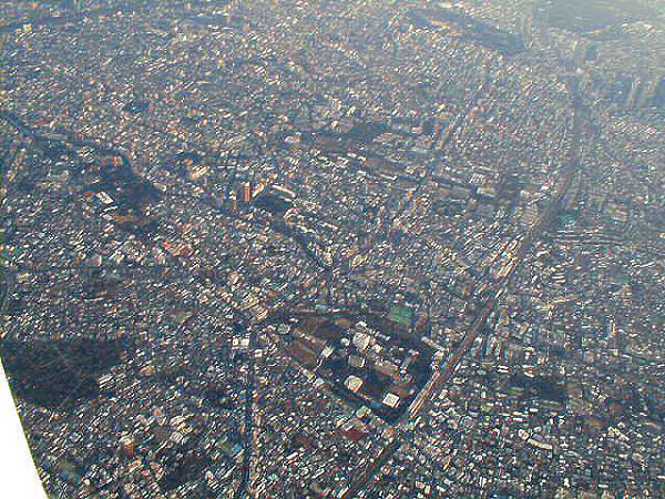 平成12(2000)年1月22日、航空部のO.B.中野高男氏(昭42経卒)がモーターグライダーで学習院上空から撮影。右1/3位に縦に走っているのが山手線、まん中縦線が明治通りです。