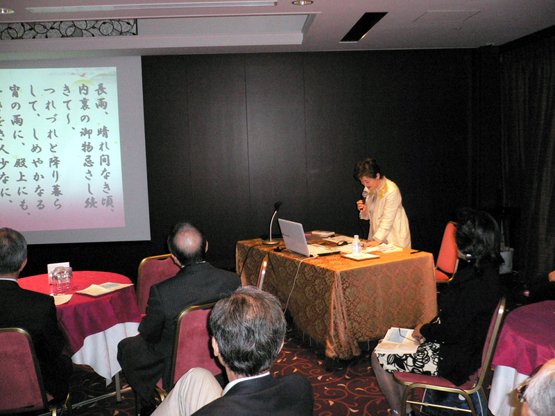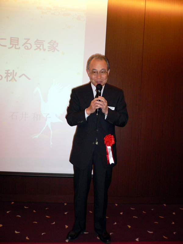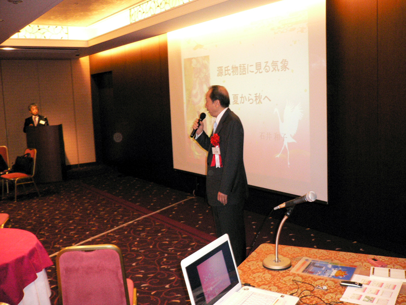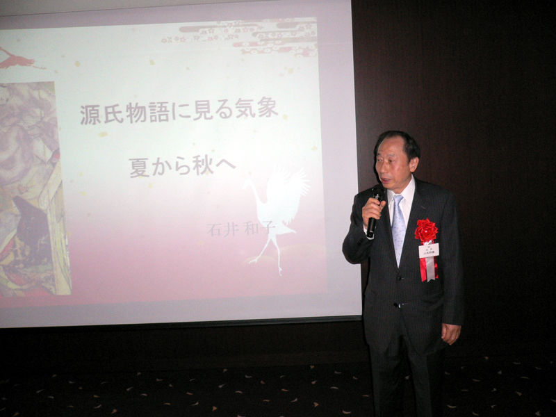 最初に山本会長よりご挨拶があり、「最近仲間に会うと、孫と病気の話ばかり、今日はそういうことは忘れて大いに楽しもう!」と参加者に話かけられたのに続き、桜友会の耀副会長からは、ピラミット校舎の跡地に完成した中央教育研究棟12階に桜友会が利用できるラウンジが秋には開設されること、また現在学習院が進めている「教育改革推進資金」のご協力依頼の話がありました。今回は趣向を変えて、第1部に教養カルチャーを企画し、講師に当部出身のアナウンサー石井和子(旧姓山口)さんを迎えて、講演をお願いしました。演題は「天気で語る 源氏物語-平安の気象予報士 紫式部」。石井講師は長く気象予報士会の会長を務め、講演と同名の著書で日本文芸大賞研究優秀賞を受賞するなど、多くの分野で現在も活躍中です。紫式部が生きた平安の雅の世界にも厳しい季節の移り変わりがあった、ことが印象に残りました。