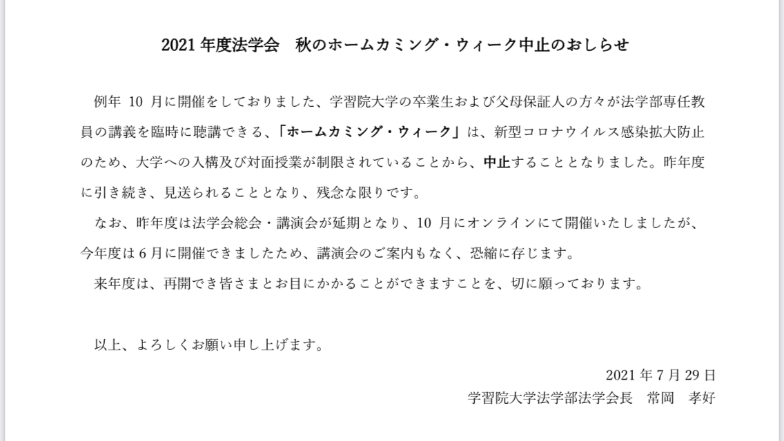 2021.07.28 学校学部:法学部同窓会 令和3年度 法学会主催「ホームカミングウィーク」中止のお知らせ 例年10月に開催をしておりました、学習院大学の卒業生および父母保証人の方々が法学部専任教員の講義を臨時に聴講できる、「ホームカミング・ウィーク」(法学会主催)は、新型コロナウイルス感染拡大防止のため、大学への入構及び対面授業が制限されていることから、今年度も中止することとなりました。