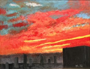 内藤 政武 先生 (学習院名誉院長) 「暮れ行くも明日は晴れ(高層ビルからの夕焼け)」 油彩