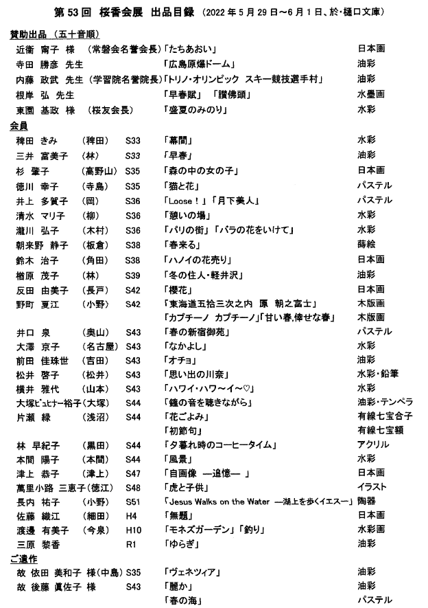 第53回桜香会展(女子部卒業生の絵の会)が令和4(2022)年5月29日~6月1日、神谷町・ギャラリー樋口文庫にて3年振りに開催され、約300名の皆様にご来場いただき盛会でした。