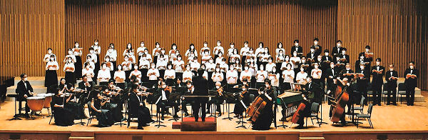 昨年の音楽部合唱団OB合唱祭では、無観客でピアノ伴奏によるヘンデル「メサイア」より抜粋した小曲、今年は大ホールでOB管弦楽団の皆さまとの再チャレンジでした。小曲数も増やしました。