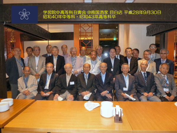 2016.10.01 その他同窓会団体:その他同窓会団体 学習院中高等科丑寅会2016 【昭和40年中等科・昭和43年高等科卒の同期会です。丑寅会の名前の由来は、昭和24年が丑年、25年が寅年生まれにちなんで付けました。】平成28年9月30日、南国酒家目白店にて開催しました。先生方7名を含め、50名が出席しました。 前列左より、手塚(化学)、佐藤(代数)、近藤(漢文)、石崎(世界史)、従野(体育)、長瀬(地学)、清水(音楽)各先生方