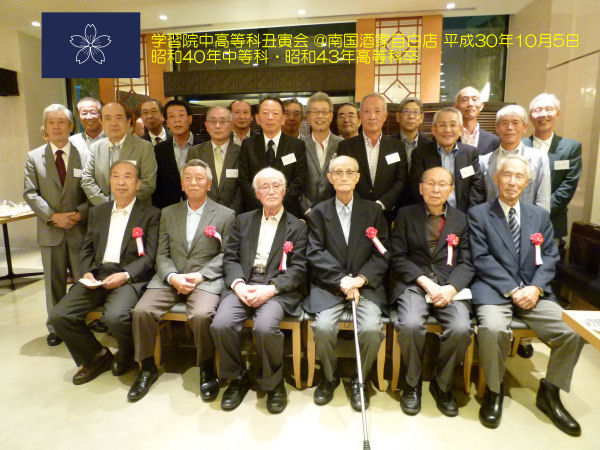 2018.10.06 その他同窓会団体:その他同窓会団体 学習院中高等科丑寅会2018 【昭和40年中等科・昭和43年高等科卒の同期会です。丑寅会の名前の由来は、昭和24年が丑年、25年が寅年生まれにちなんで付けました。】平成30年10月5日、南国酒家目白店にて開催しました。先生方6名を含め、47名が出席しました(物故者31名)。大変和やかで楽しい会になったと思います。学生時代はそれ程親しいわけではなかった方ともお話ができ有意義な時間でした。またお会いできるのを楽しみにしております。 昭和43年高等科卒「還暦同窓会」2009開催報告はこちらをクリックして下さい。 「昭和43年高等科卒業アルバム」はこちらをクリックして下さい(PDFファイル 2.71MB)