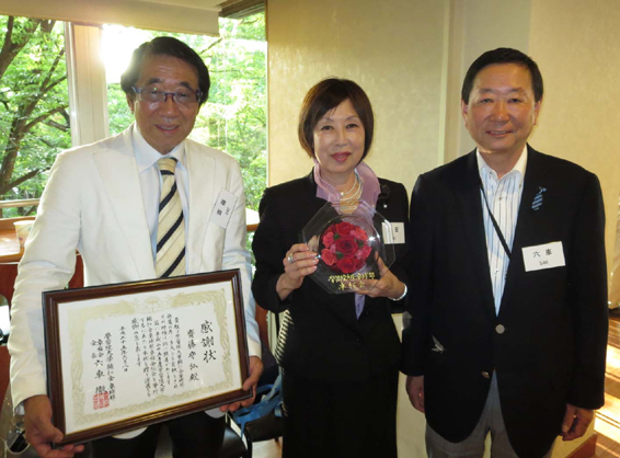 懇親会はさくらラウンジにて開催されました。卓球部で中等科、高等科、大学を通じて活躍された、S42年経済学部卒業斉藤守弘様(現株式会社協同 代表取締役社長)より今後の輔仁会卓球部の発展の為に多大なご寄付を頂きました。このご厚意に際し、OBOG会卓桜会より深甚なる敬意を表し感謝状と記念品を贈呈しました。またご寄付に際しましては、斉藤様と同級生であり女子中等科、高等科で卓球部で活躍された現桜友会理事の三田由美様からもお口添えご協力を賜りました。贈呈式の後、斉藤様よりスポーツ(サッカー、卓球等々)を通じて学習院らしさを持った明るく社会に役立つ人間を輩出して欲しいと力強いご挨拶を頂きました。その他、甲南大学OBの山口洋一様、宮崎より参加された野田英世様、リコー卓球部の技術指導員をご紹介いただいた山田哲夫様よりご挨拶のお言葉をいただき、最後に学習院院歌を斉唱、エールを交換して散会となりました。