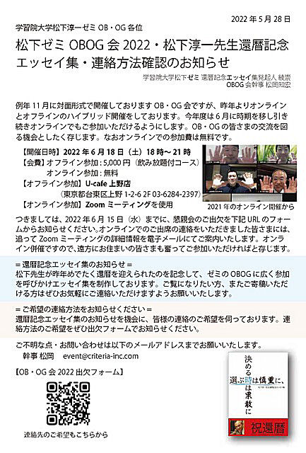 松下ゼミOBOG会2022・松下淳一先生還暦記念エッセイ集・連絡方法確認のお知らせ
