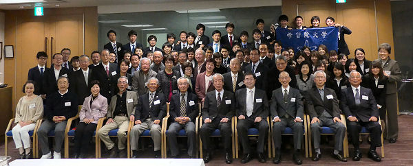 桜球会は、学習院大学・短期大学・女子大学の卒業生で、卒業時にソフトテニス部に在籍した会員で構成され、会員の親睦とソフトテニス部を援助することを目的としています。式典は、来賓として現部長の神戸先生(経済学部)や前部長の片瀬先生(理学部)をお招きし、卒業生46名と現役29名の参加を得て盛大に開催しました。最高齢は82歳の先輩で、改めて我が部の歴史と伝統の深さに触れることができました。現役時代を熱く思い出す先輩達からは近年良い戦績の現役部員に対して、心のこもった激励の言葉がかけられていました。式典は全員での院歌とエールにて終了となりましたが、近い内に再び開催して欲しいとの先輩命を受けました。今回ご都合で参加出来なかった皆様、その時は宜しくお願いします。
