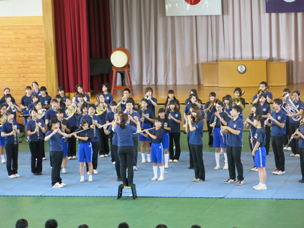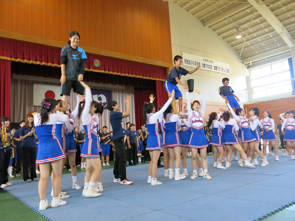 チアリーダー部によるスタンツ(組体操)体験、吹奏楽部と同中学校吹奏楽部との合同演奏、そしてリーダー部主導による応援指導を通して、子供達に元気をお届けしました。