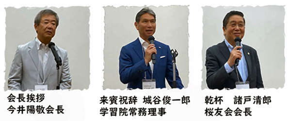 ご来賓として、学習院常務理事・城谷俊一郎様、桜友会会長・諸戸清郎様のご列席を賜りました。総会では、活動報告、会計報告のほか、次年度からの総会・懇親会の開催方法について議論されました。