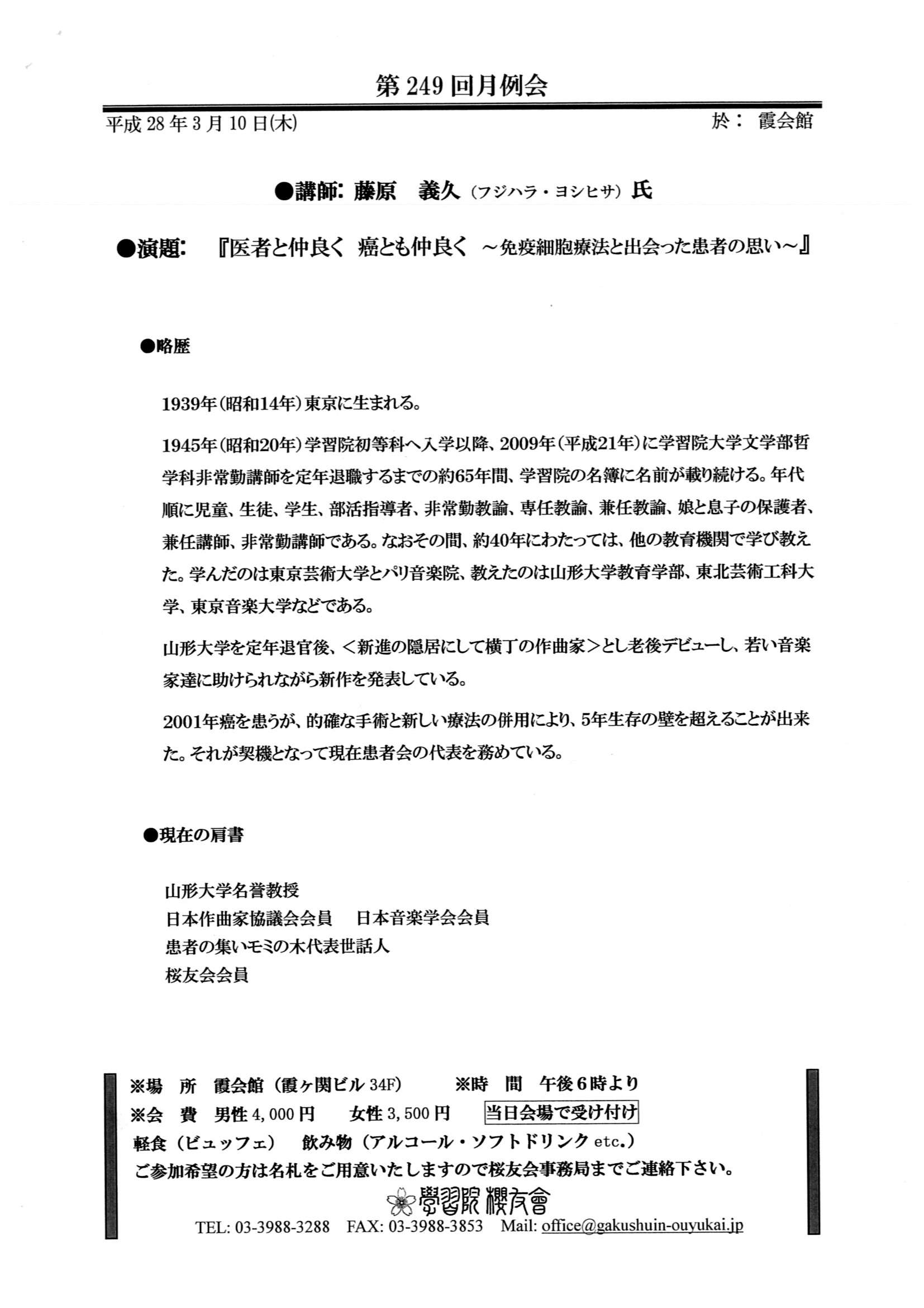 2025.06.10 卒業生情報:訃報 訃報 元中等科高等科音楽教諭 藤原義久先生 学習院初等科~中高等科を1958年に卒業、その後東京藝大作曲家とパリ国立音楽院卒業、長年にわたり学習院中高等科に音楽の教諭として、また大学文学部哲学科非常勤としてお勤めになった藤原先生が令和7年6月3日に86歳でお亡くなりになりました。謹んでお悔やみ申し上げます。※平成28年3月10日霞会館にて、第249回桜友会月例会に講師としてご登壇頂いた時のプログラムより転載させて頂きます。