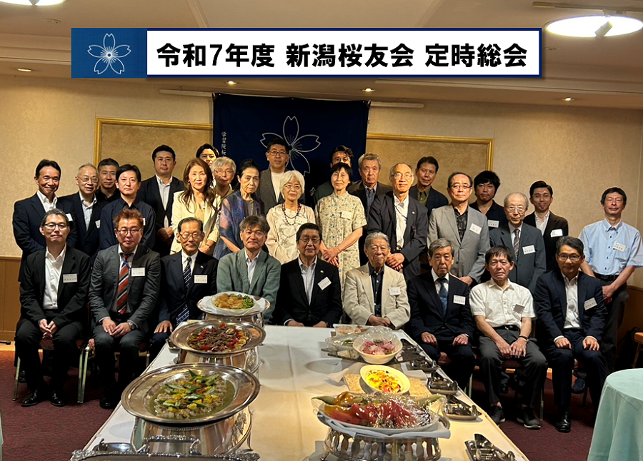 2025.07.14 全国支部:新潟桜友会 令和7年度「新潟桜友会」定時総会開催報告 新潟桜友会は令和7年度の定時総会を、令和7(2025)年7月12日に万代シルバーホテルにて開催いたしました。当日は桜友会本部より諸戸会長を始め、宮城桜友会、静岡桜友会、富山桜友会、長野桜友会、石川桜友会の各支部の役員の方々からもご出席いただき、地元新潟の会員とあわせて31名の出席者で賑やかな総会、懇親会となりました・・・