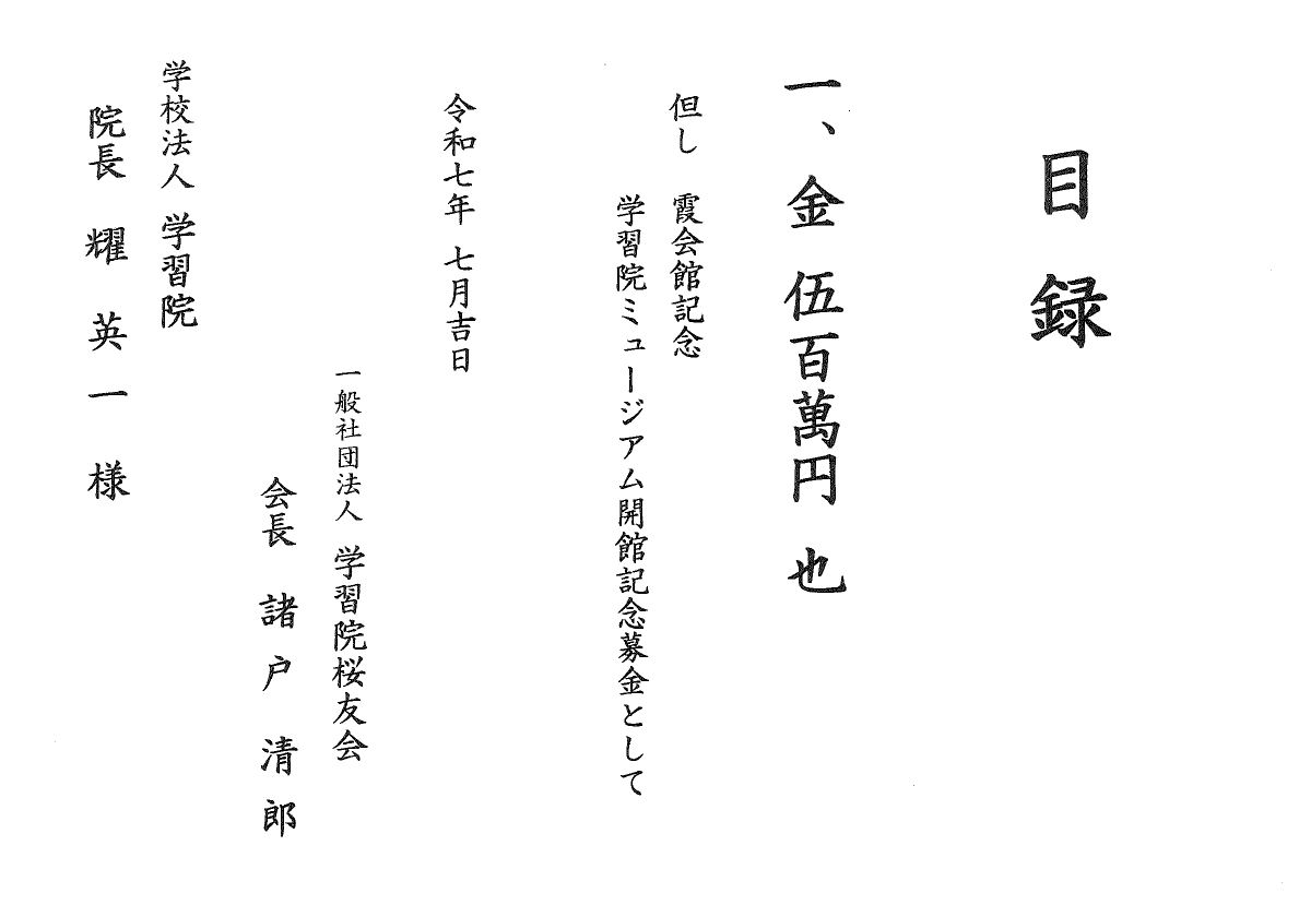 2025.07.25 本部行事:卒業生催事・イベント #総務 霞会館記念 学習院ミュージアム開館記念募金への寄付 令和7年7月25日、学校法人学習院に「霞会館学習院ミュージアム開館記念募金」として500万円を寄付いたしました。