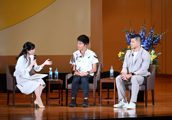 その後東島さんのインタビューに応じながら、それぞれのスポーツを始めたキッカケから学習院大学時代のエピソード、ケガなどの挫折からどう気持ちを切り替えて栄光を掴んだのかなどのストーリーに話は展開されていき、観客も興味深く引き込まれていきました。