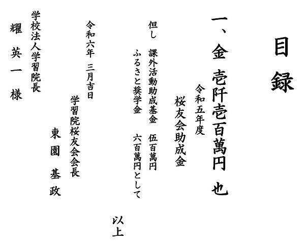 2024.04.02 本部行事:卒業生催事・イベント #総務 令和5年度 桜友会助成金/学習院への寄附 令和6年3月27日、一般社団法人学習院桜友会から学校法人学習院に寄付贈呈をいたしました。令和5年度として1,100万円の寄付です。