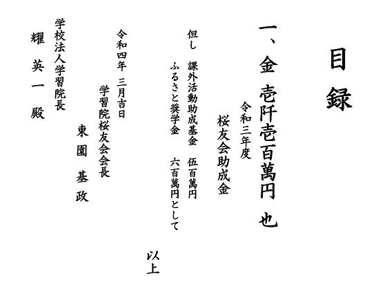 2022.03.29 本部行事:卒業生催事・イベント #総務 令和3年度桜友会助成金 寄付贈呈 令和4年3月25日、一般社団法人 桜友会から学校法人 学習院に寄付贈呈をいたしました。令和3年度として1100万円の寄付です。