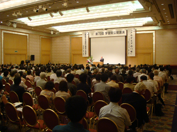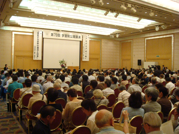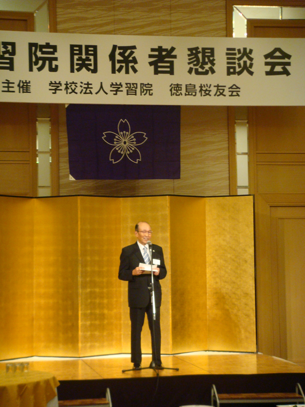 2011.07.11 全国支部:徳島桜友会 第73回学習院公開講演 学習院公開講演が、徳島市のホテルクレメント徳島にて開催され、会場満員の500人の参加がありました。開会にあたり波多野学習院長よりご挨拶。引き続き、平野次郎氏の講演「アカデミアの11年」、磯村尚徳氏の講演「激変する世界の潮流と日本」があり、お二人の、NHK時代のお話や諸外国のVIPに対する取材のお話など、興味深いお話をお聞きすることができました。学習院広報課のブログにも掲載されてます。