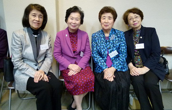 【写真下左から】奥平紀子(昭40短家)、安堂洋子(昭46短文)、塚本優子(昭33短家)、東倉彰子(昭43短国)の各氏