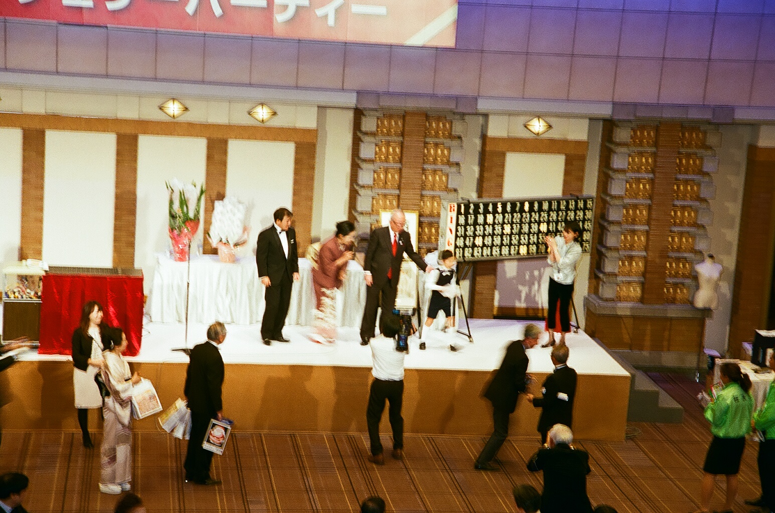 今回は総勢786名という大勢の方々にお集まりいただき、広い孔雀の間が溢れてしまう程の盛況で御座いました。今回は桜友会設立95周年、チェリーパーティー50回記念という事もあり、チェロの記念演奏もあり又、ビンゴ賞品も例年の自動車、院長賞、会長賞に加え、ハワイ、シンガポール旅行等々豪華な賞品が沢山あり会場は熱気に包まれました。